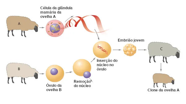 . Os clones, estes que podem ser o resultado de procedimentos laboratoriais, ou não, como é o caso da fissão binária de bactérias, na qual uma pré-existente origina duas novas, idênticas entre si.